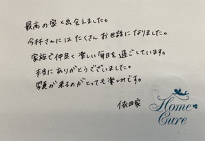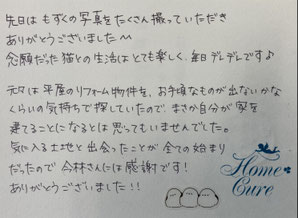 金子様 メッセージありがとうございます! お引渡日が決められていた物件のためご契約日からお引渡し日までの期間が長く 何度ものメールのやり取りやお話をしていてお引渡し日には少しさみしくなりました。 最初にご覧になった物件でお話が進んでいき戸惑いもあったようですが ネットで見てピンときた!という直感は素晴らしいです。 写真撮影日には県外に住むご家族も集まりにぎやかであたたかい雰囲気に私も あたたかい気持ちになりました。 これからもご家族が帰ってくる笑顔あふれる場所であることを心より願っております。 素敵なご縁に感謝です。 |